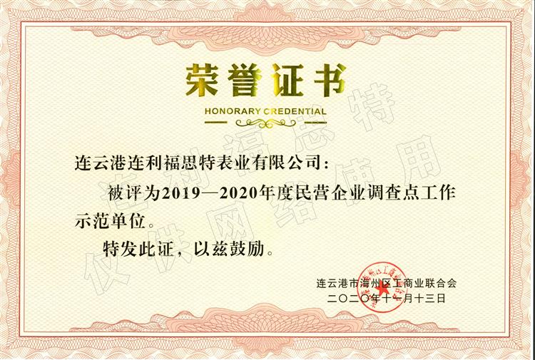 近日,连云港连利福思特表业有限公司荣获“2019-2020年度民营企业调查点工作示范单位”称号。